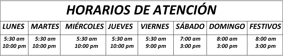 Lunes a Jueves: 5:00 h a 22:00 h